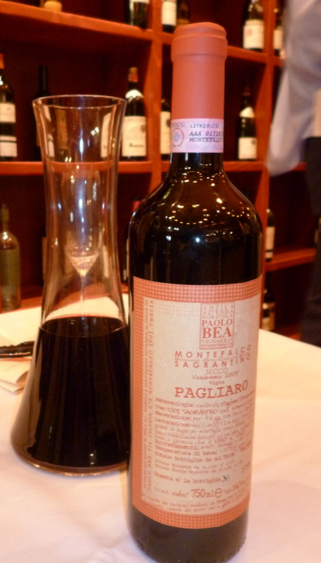 Brut NV (Fiano, Aglianico, Barbera). Very nice with a light copper color and a crisp, citrus finish. The 1995 Felsina Chianti Classico Riserva had a brick rim with a big perfume of menthol and red roses, tarry fruit and crisp acids on the finish. The 1999 Bovio Barolo Riserva Parussi was dark red with an orange robe, dried mushroom, tar and rose petals on the nose with silky fruit and a mouthful of tannins on the long finish. The 2005 Paolo Bea Sagratino di Montefalco Pagliaro was dark red with a slighty closed nose of roses and black cherry, chewy, dense fruit and good structure on the long finish. I would say this was my favorite red wine of the night.