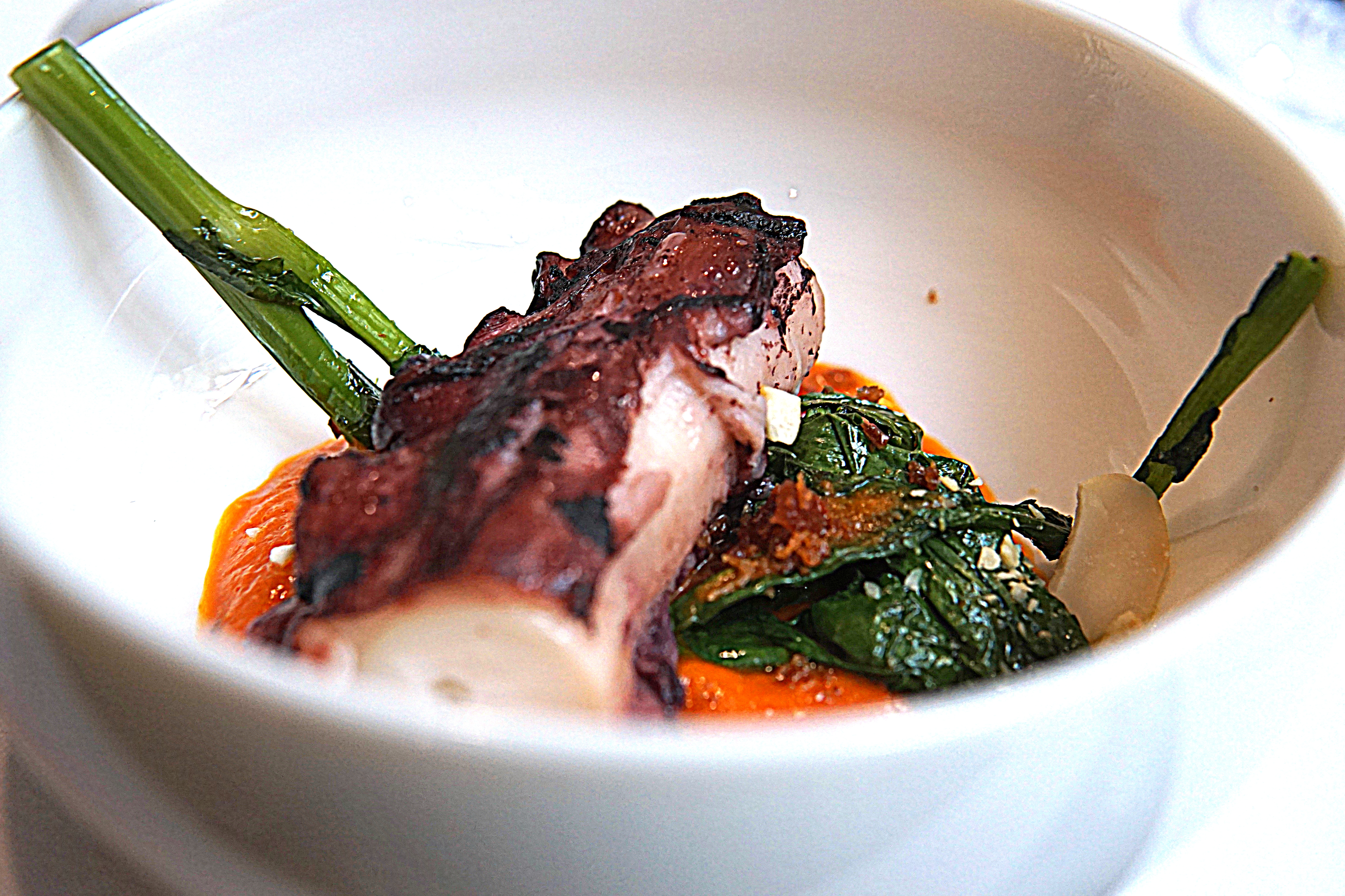 Tender grilled octopus served with vesuvio tomatoes.